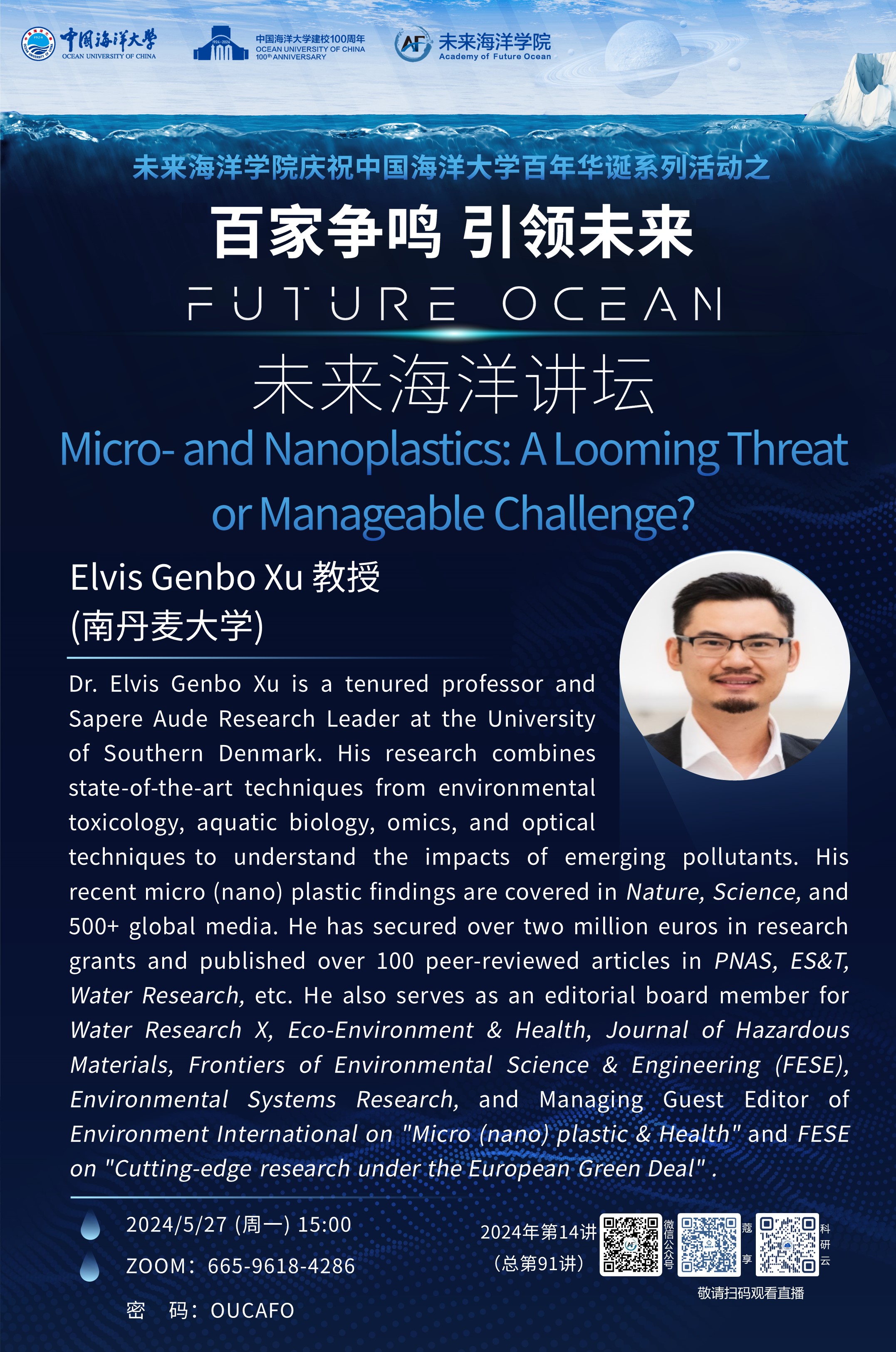 • 百家争鸣 引领未来丨未来海洋讲坛第91讲 (2024年第14讲) -Elvis Genbo Xu: Micro- and Nano plastics: A Looming Threat or Manageable Challenge?