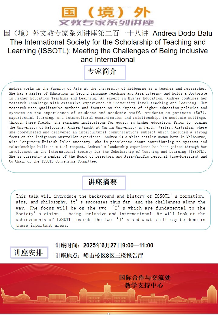 国(境)外文教专家系列讲座第二百一十八讲-Andrea Dodo-Balu:The International Society for the Scholarship of Teaching and Learning (ISSOTL): Meeting the Challenges of Being Inclusive and International