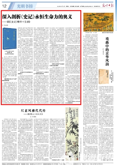 《光明日报》2024年10月12日 12版 孟子曰:“观水有术,必观其澜。”《史记》记载了自上古皇帝时代至西汉汉武帝年间三千余年的历史,其治史宗旨与编纂思路开创史学无数极则,滋养历代史家灵思,故经千年而生机勃发。如此一座富矿自然引得古今学人倾心研索,两千年来有关《史记》的研究成果层出不穷。然而,“旧题新作”最考验学术功力。北京师范大学历史学院教授陈其泰钻研《史记》40余年,积淀深厚。日前,他推出《〈史记〉精华十五讲》,站在新的时代高度,以敏锐的学术眼光捕捉“水之波澜”,开辟了新视野,提出了新问题。重新解读《史记》“五体”的本质和功能 《史记》由“本纪”“表”“书”“世家”“列传”五体互相配合而成,向世人展现了一幅波澜壮阔而又丰富多彩的历史画卷。对于这一宏伟创造,历代研究者都毫不吝啬夸赞之词,充分肯定其创新价值,但多数从外在形式立论,未能更进一步揭示其内在本质。陈其泰认为,五体配合这一新形式的出现,实际上是人类对自身认识从简单到复杂的体现。随着人类对自身认识向较高层次发展,其对历史的观察由单一视角发展到多重视角,反映到历史记载上,就由朴素、简略发展为复杂、丰富。五体配合正是司马迁在继